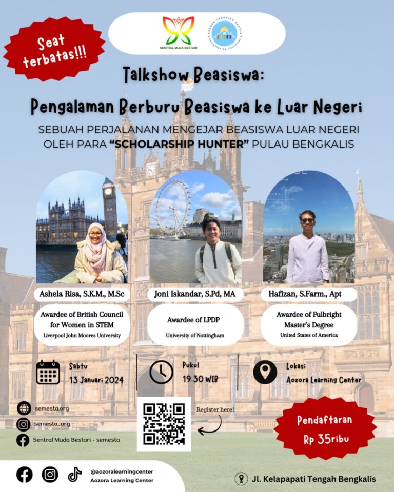 🌟 Semesta & Aozora Learning Center Presents: Talkshow “Pengalaman Berburu Beasiswa ke Luar Negeri” 🌏…